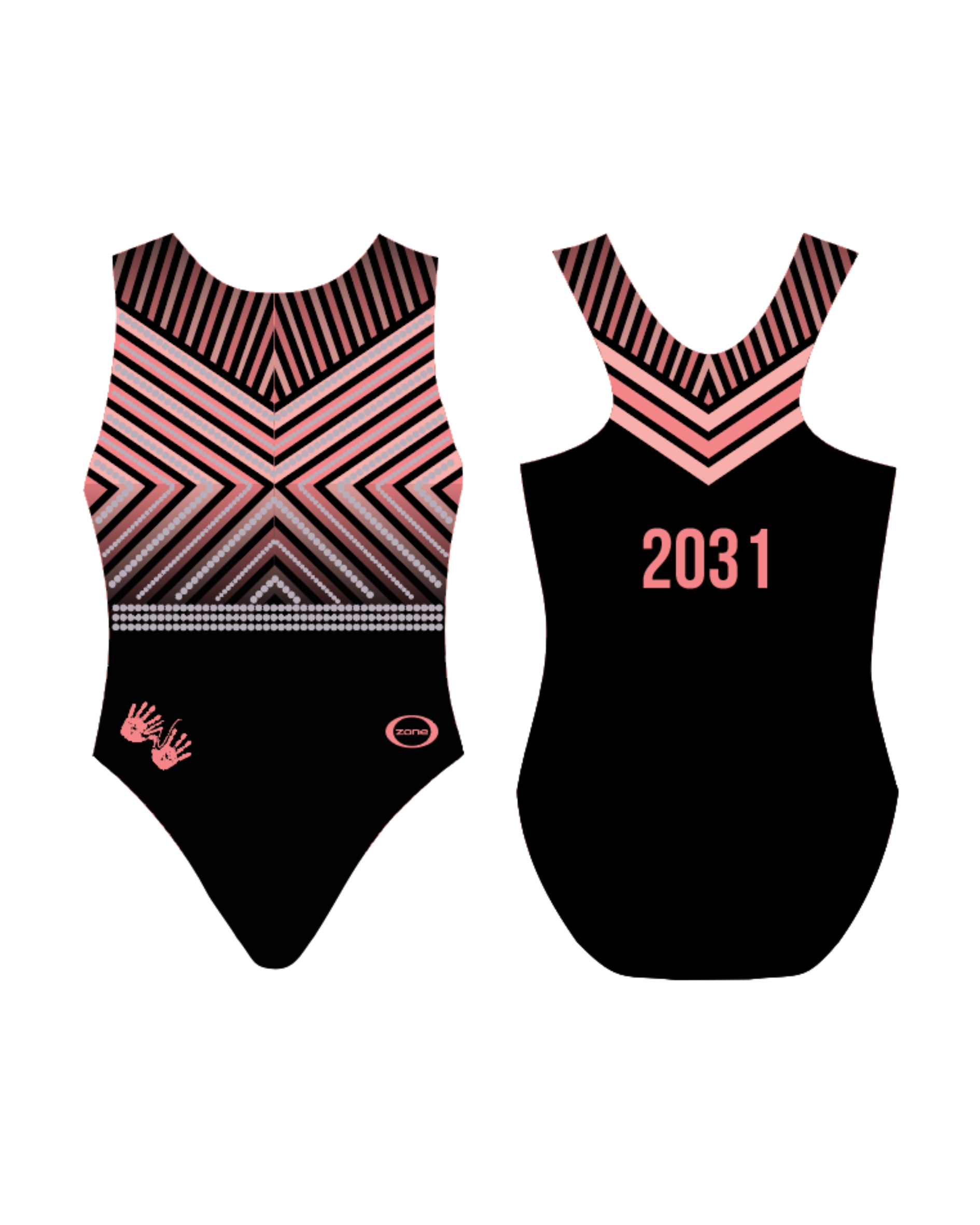 Velocity is a sublimated racerback leotard with a black lower body and a bold geometric upper in Coral and Light Coral. Iridescent rhinestones accent the front, and the back features 2031 in Coral.