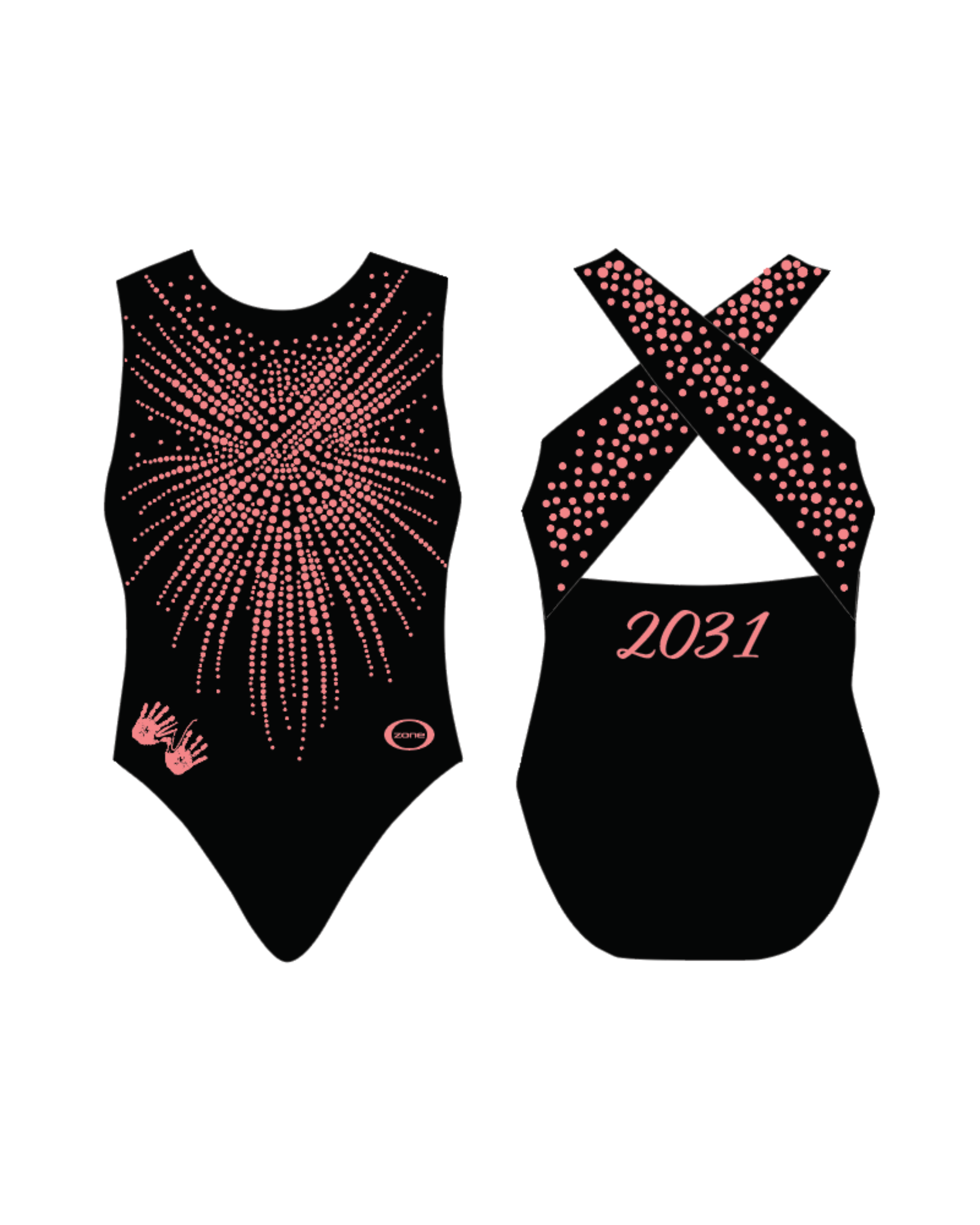 Radiance is a sublimated cross back leotard with a sleek black bodice accented by coral rhinestones that radiate across the front and continue onto the back straps. The back features 2030 in Coral.