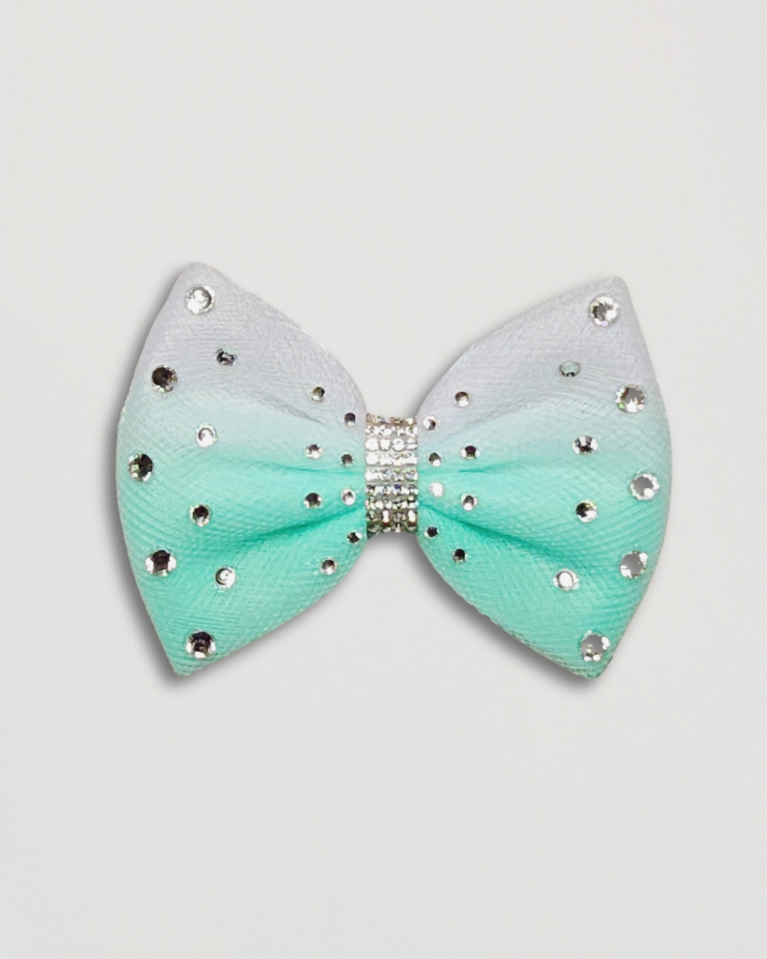 Crafted in partnership with Gardenia Meadow Bows, this mint and white ombre bow is detailed with iridescent crystals for a subtle touch of sparkle. Designed to perfectly coordinate with the Frosted Mint Leotard to complete the look.