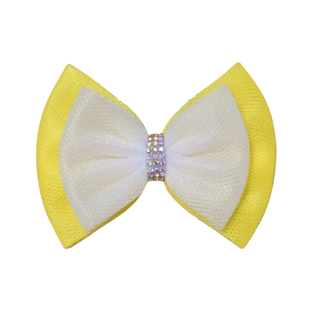 The Golden Hour bow is a stunning yellow and white double bow designed to pair flawlessly with our Golden Hour Paisley Leotard from the Paisley Party Profile Holder Exclusive collection. Just like the leotard, you can choose to adorn your bow with iridescent crystals or keep it sleek with no embellishments. Crafted by Gardenia Meadow Bows, this piece is part of a special collaboration with Chalk Warrior.